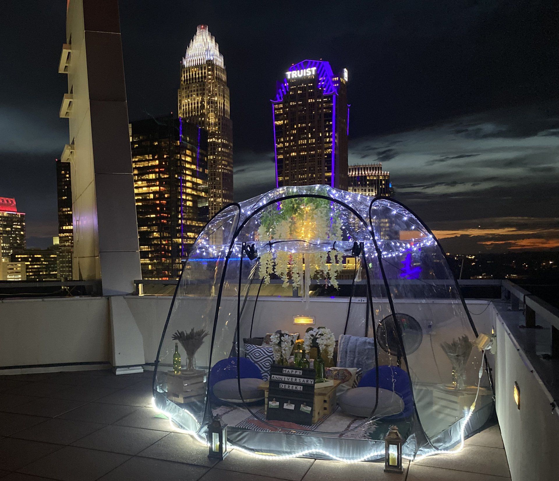 2-4 person sitting, up to 6 people standing dependent on décor/package selection. Our quaint Bubble Tents are perfect for intimate events or picnics with 360-degree views, stargazing, and various décor selections you can make this experience your own. Our Bubble Tents are great year-round retaining heat in the winter and in the summer, leave the door up to allow air flow